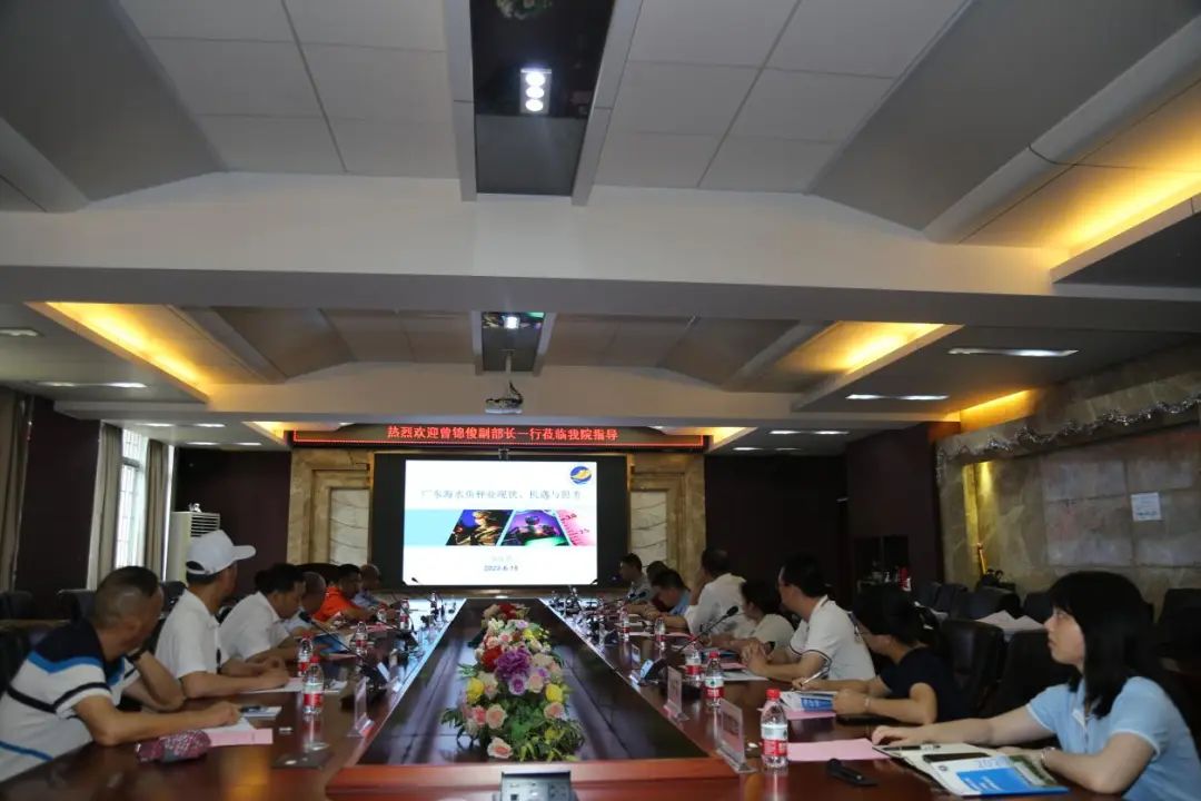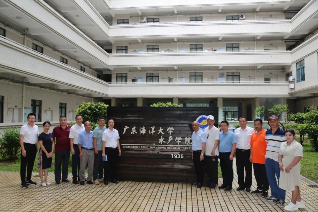 调研组一行到访广东海洋大学水产学院,得到该院副院长邓岳文教授的热情接待。座谈会上,水产学院汤宝贵教授以广东海水鱼种业现状、机遇与思考作主题发言,江门顺德商会会长郭文龙、珠西创谷(江门)科技园有限公司萧佳粤博士、黄松华博士、江门市海洋集团董事成炜、广东省亚克迪新材料科技有限公司董事长李成财也对海洋牧场建设和海工装备与专家教授展开分享交流。